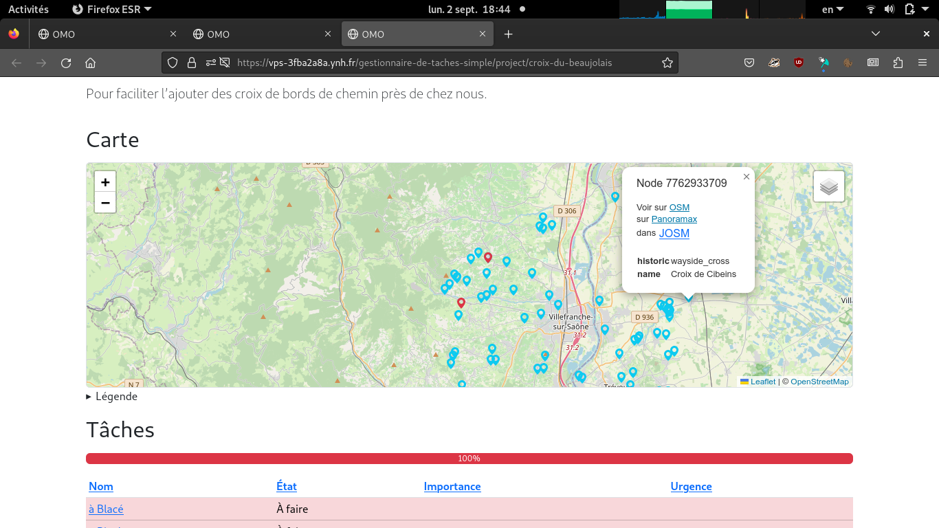 On souhaite cartographier les croix des bords de chemin dans le Beaujolais. Circulant régulièrement dans le coin, on a établi une liste d’emplacements et la description d’un certain nombre de ces édifices qui ne sont probablement pas tous mappés dans OSM.